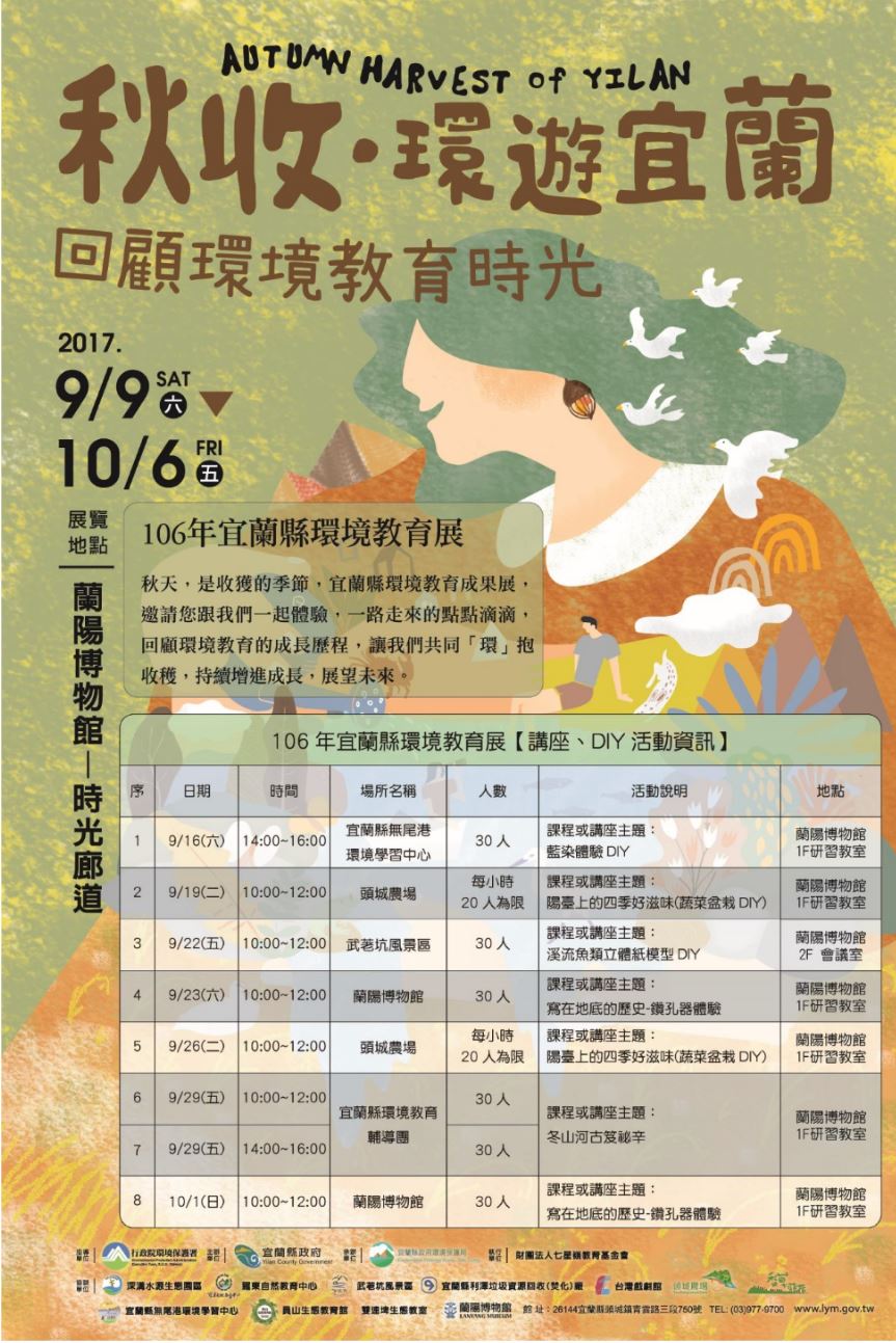 秋天,是收獲的季節,宜蘭縣環境教育成果展,邀請您跟我們一起體驗,一路走來的點點滴滴,回顧環境教育的成長歷程,讓我們共同「環」抱收穫,持續增進成長,展望未來。