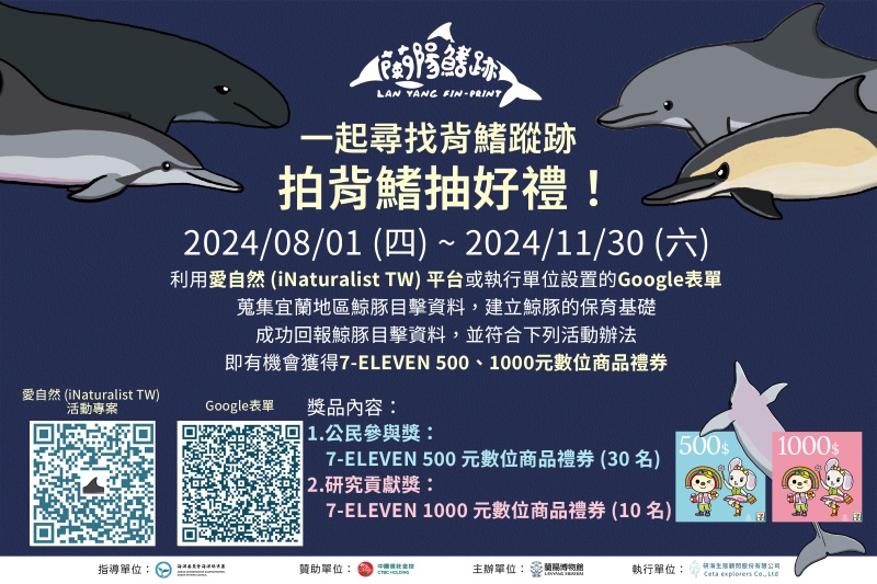 本計畫的烏石港驛站報到處、烏石港驛站外候船碼頭,以及頭城區漁會大樓報到處,作為主要展示的場域,完成6組解說及推廣資訊及標準字,包含2組位於烏石港驛站外報到處、2組位於頭城區漁會大樓報到處,及2組線上數位素材。其中生態教育解說線上數位素材為宜蘭外海常見7種鯨豚介紹組圖,公民參與推廣線上數位素材為另1套組圖,其內容包含公民科學的重要性、簡易版Photo-ID概念說明以及民眾較容易可參與的平台介紹。本計畫追加辦理公民參與推廣活動1場,以抽獎活動方式鼓勵民眾利用iNaturalist TW平台或本團隊設置之Google表單,上傳參加賞鯨行程期間目擊的鯨豚資訊及照片。