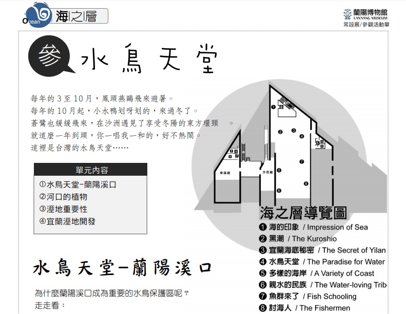 每年的3至10月,鳳頭燕鷗飛來避暑。每年的10月起,小水鴨划呀划的,來過冬了。蒼鷺也緩緩飛來,在沙洲遇見了享受冬陽的東方環頸 。就這麼一年到頭,你一唱我一和的,好不熱鬧。這裡是台灣的水鳥天堂…… 展覽日期:常設展2010年10月16日起~