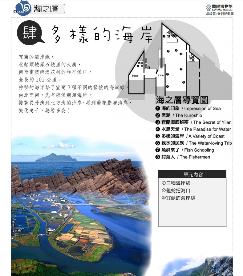 宜蘭的海岸線,北起頭城鎮石城里的大澳,南至南澳鄉澳花村的和平溪口,全長約101公里。神秘的海洋給了宜蘭3種不同的樣貌的海岸線,由北而南,先有礁溪斷層海岸,接著從外澳到北方澳的沙岸,再到蘇花斷層海岸,變化萬千,婆娑多姿! 展覽日期:常設展2010年10月16日起~