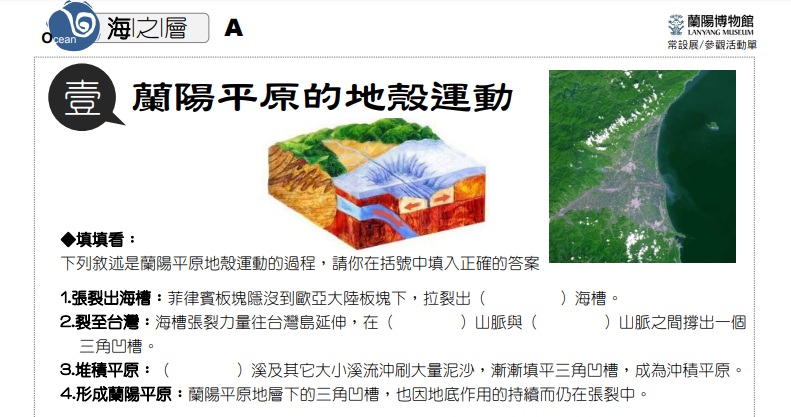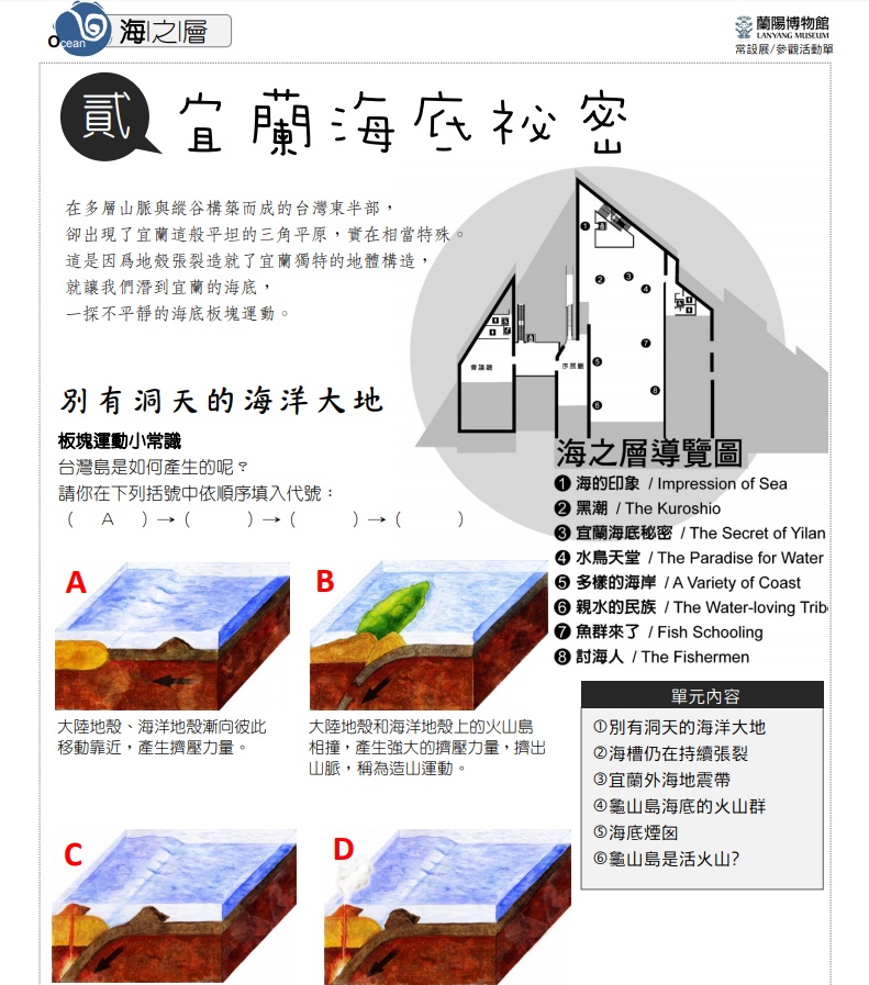在多層山脈與縱谷構築而成的台灣東半部,卻出現了宜蘭這般平坦的三角平原,實在相當特殊。這是因為地殼張裂造就了宜蘭獨特的地體構造,就讓我們潛到宜蘭的海底,一探不平靜的海底板塊運動。 展覽日期:常設展2010年10月16日起~