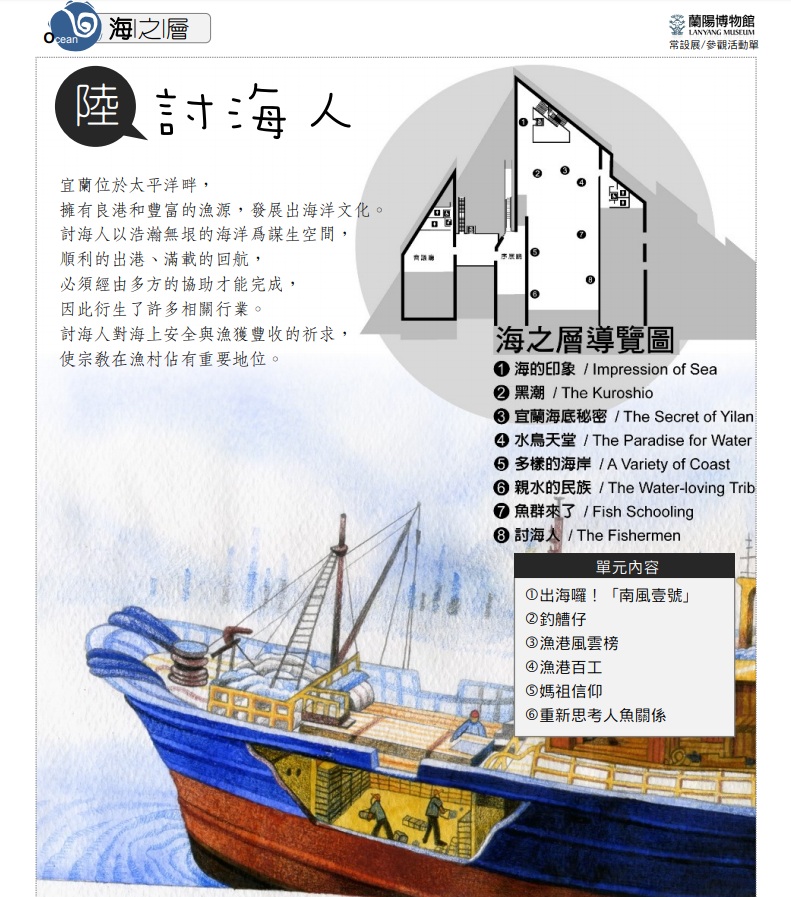 宜蘭位於太平洋畔,擁有良港和豐富的漁源,發展出海洋文化。討海人以浩瀚無垠的海洋為謀生空間,順利的出港、滿載的回航,必須經由多方的協助才能完成,因此衍生了許多相關行業。討海人對海上安全與漁獲豐收的祈求,使宗教在漁村佔有重要地位。 展覽日期:常設展2010年10月16日起~
