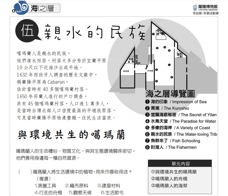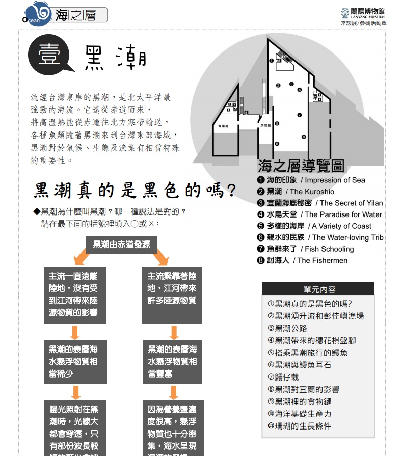 蘭陽溪匯合平原上的河流走向海洋,連結從赤道北上的黑潮,讓我們順著潮流,沈潛,湧升,在鰻魚苗群的洄游及珊瑚的搖曳之間,領略海底火山的震動。 展覽日期:常設展2010年10月16日起~